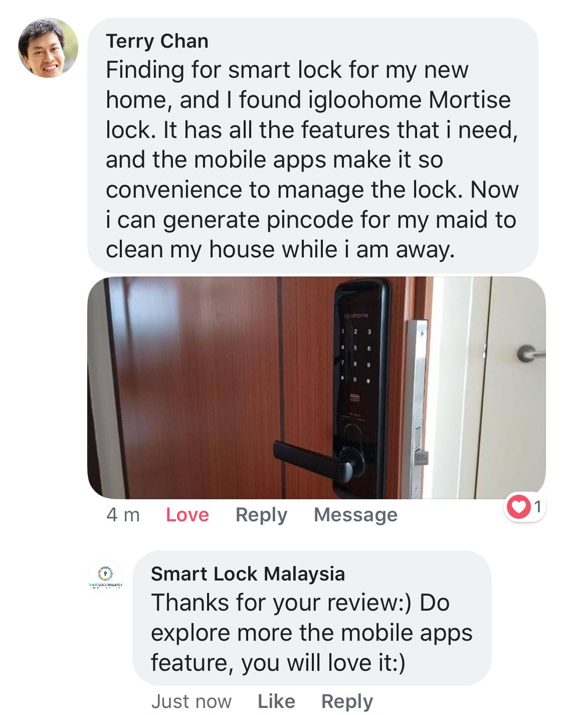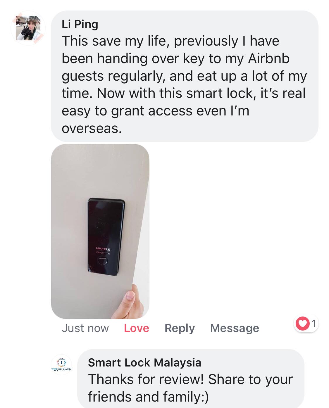 "It saves a lot of time previously for handover keys to my airbnb guests. The guests like the easy check-in process using pincode"